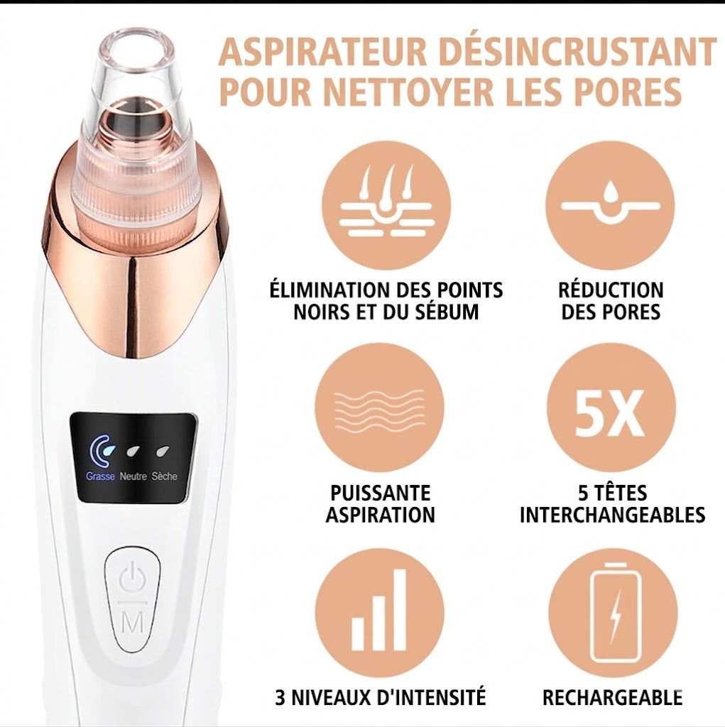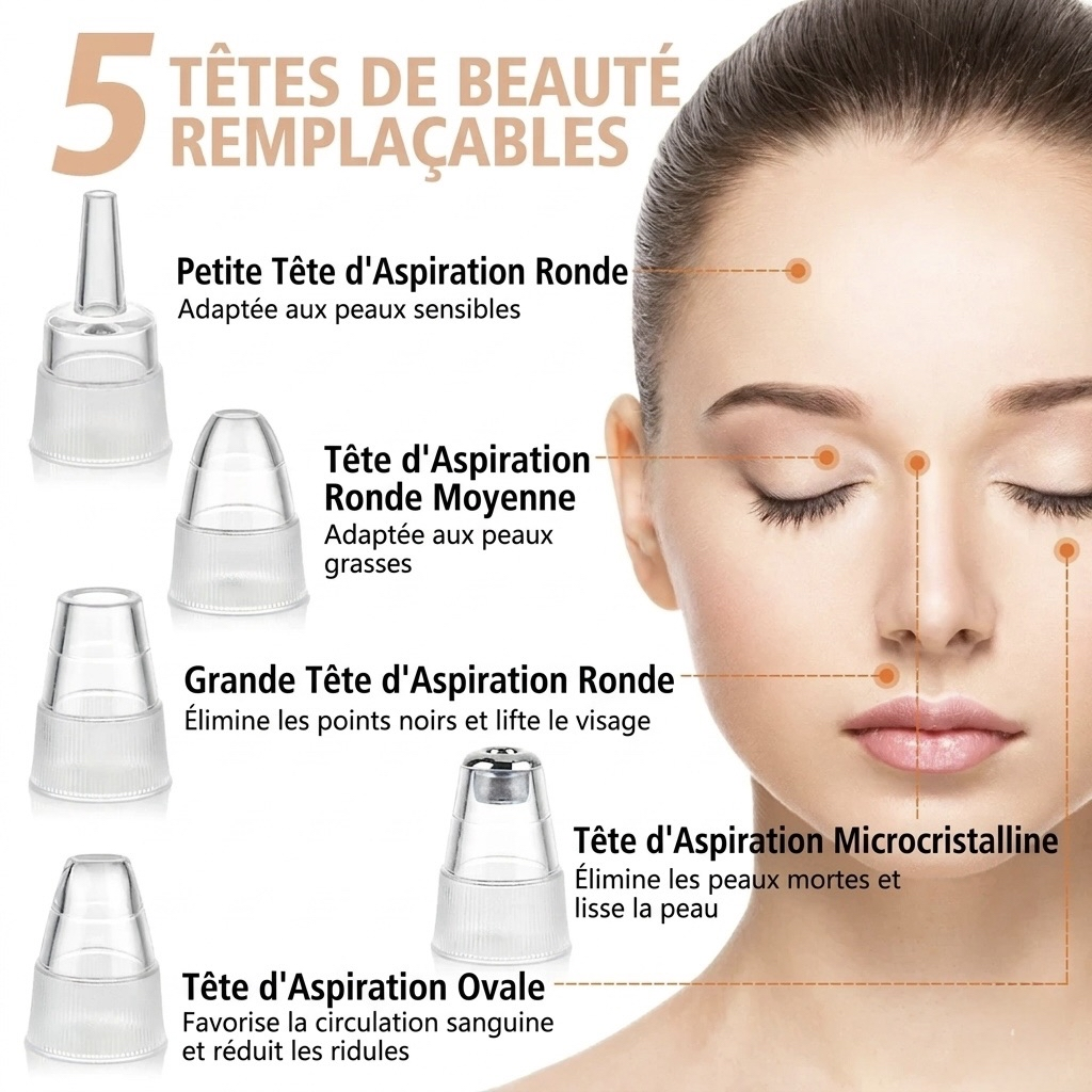 Oui, grâce à 5 embouts interchangeables, vous pouvez traiter chaque zone: nez, joues, front, menton, ou même exfolier en douceur. Cela permet un soin 100 % personnalisé, comme en institut.